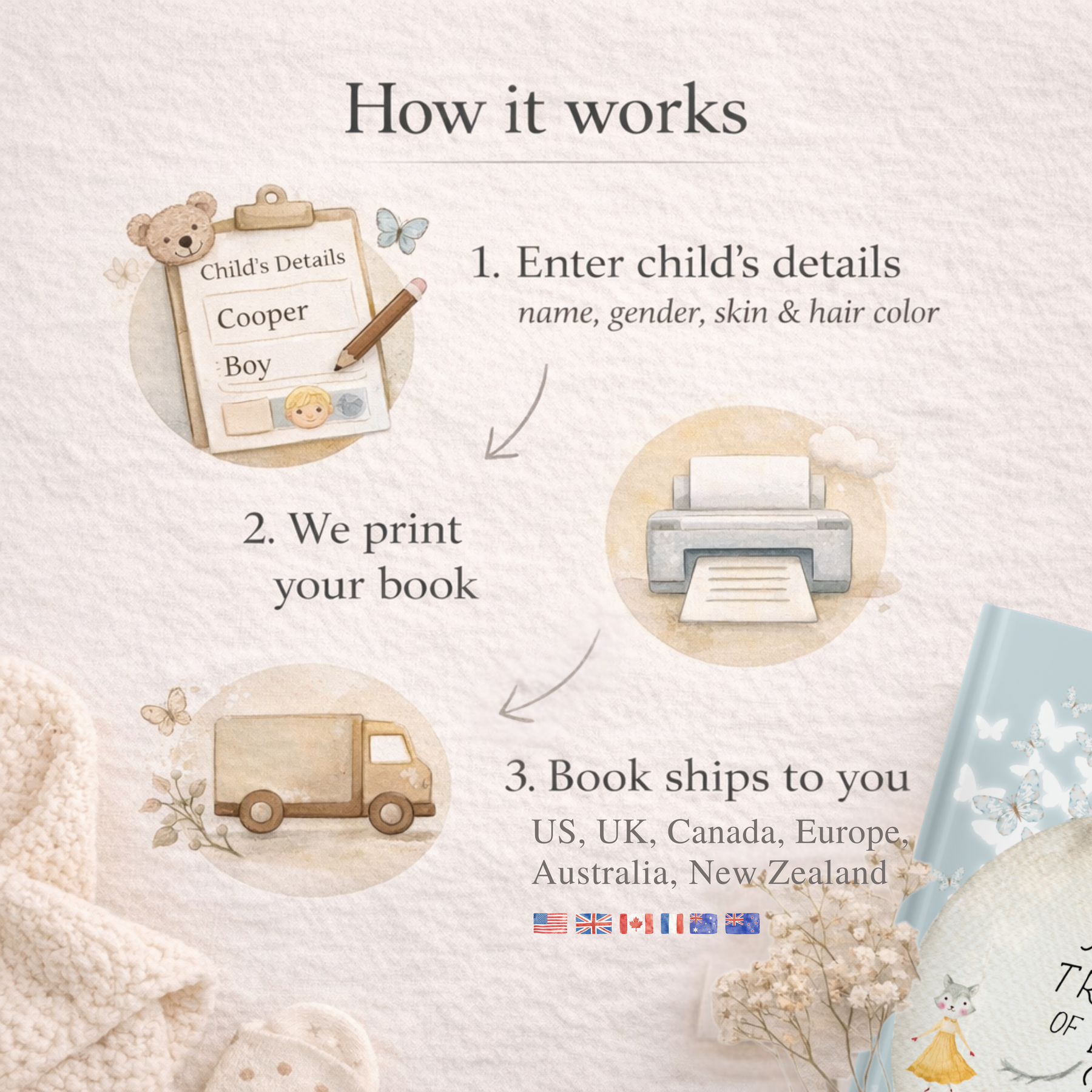 *** Need more characters? Our books are as unique as our little readers. We are happy to add a friend/sibling to the story at no extra cost. For custom orders please contact us directly.
